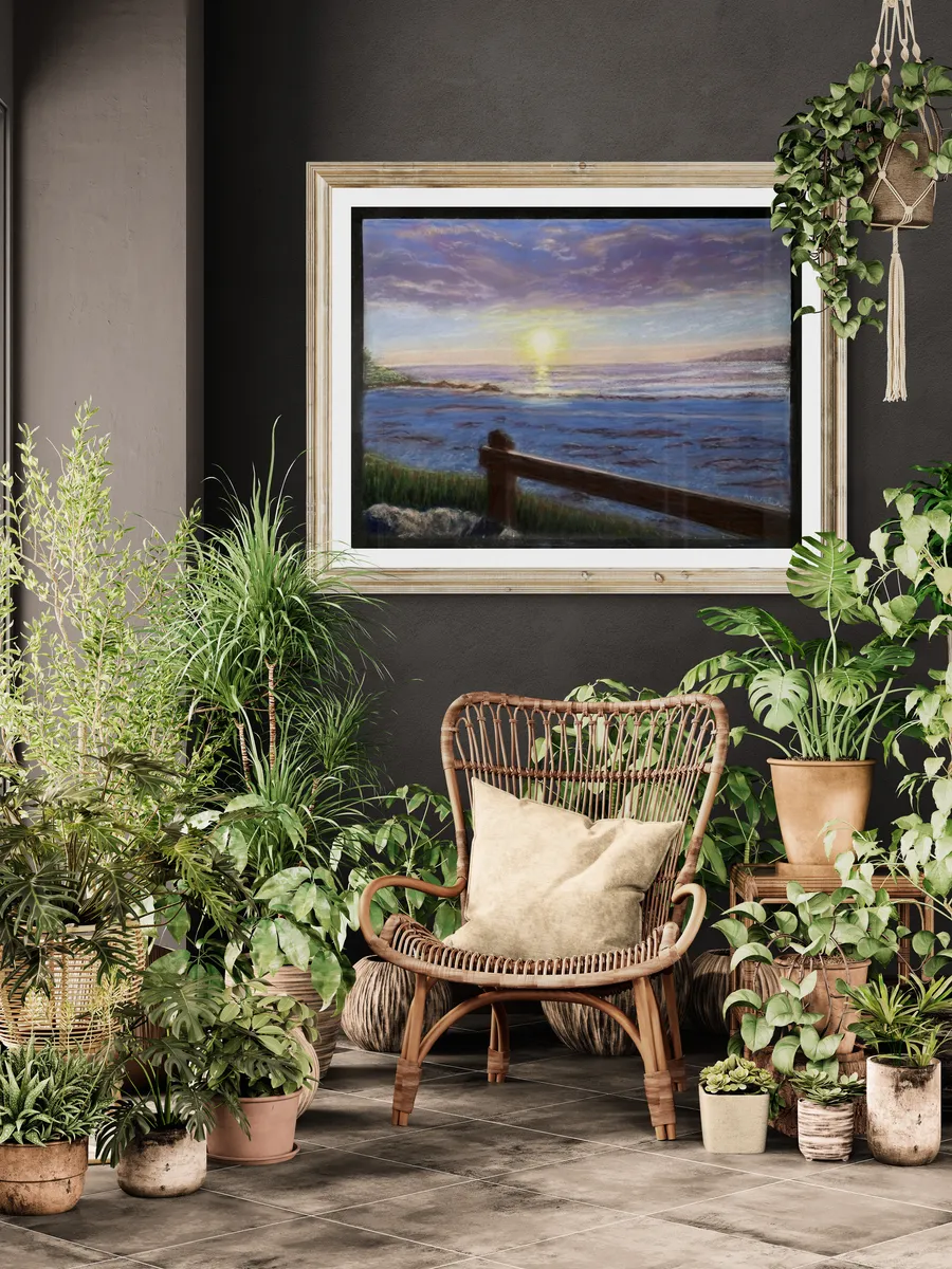 plant-room-with-cane-chair and my painting of A Carmel Bay Sunset.
