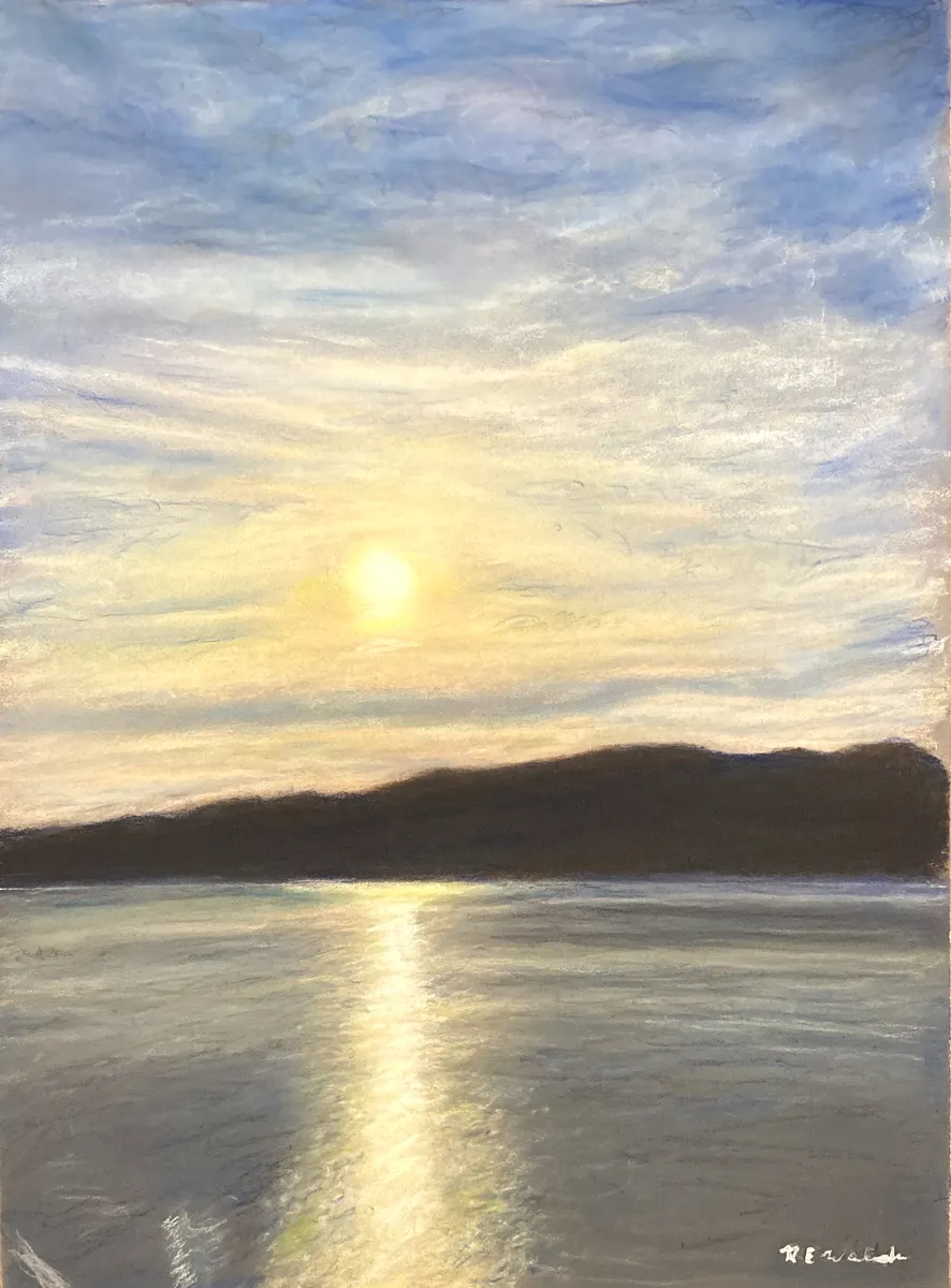 plant-room-with-cane-chair and my painting of A Carmel Bay Sunset.