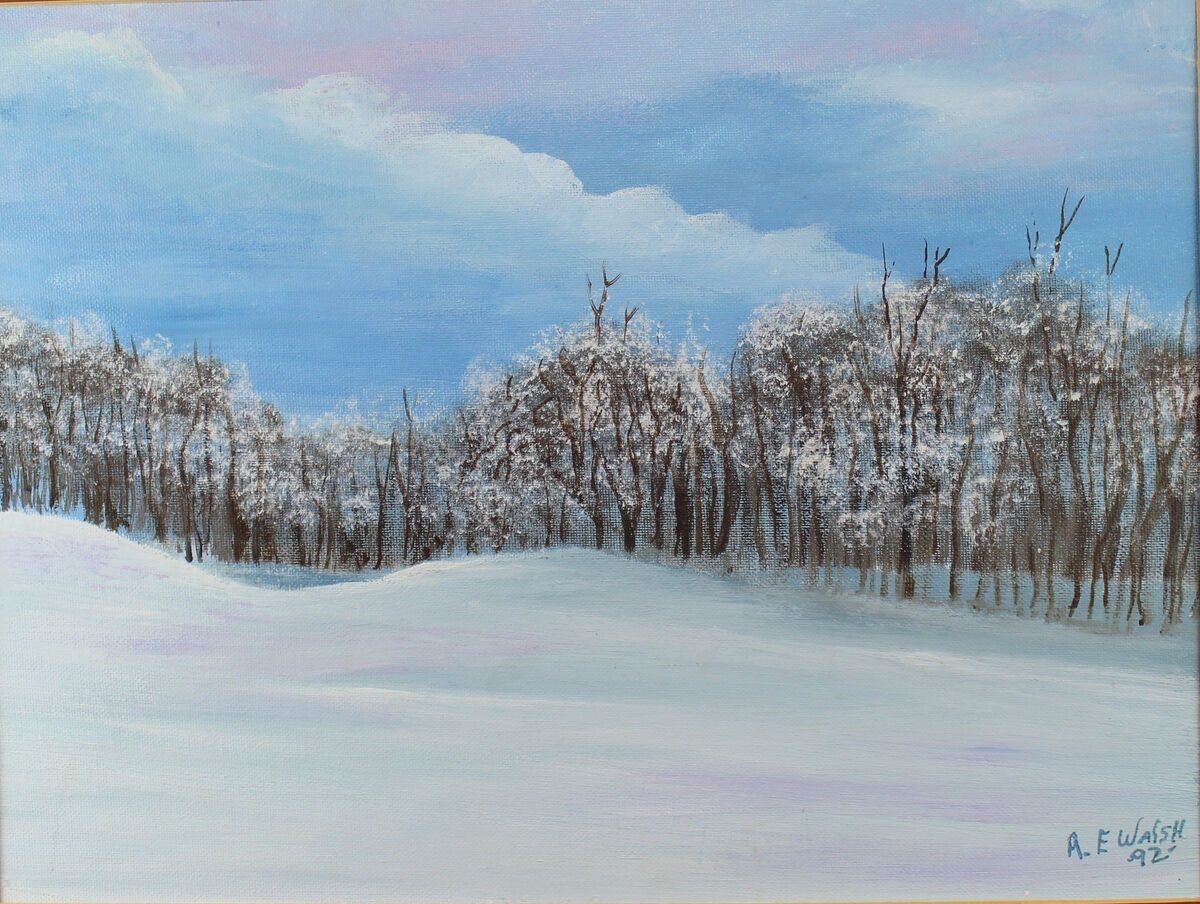 REWalsh-My Art I was hiking through the winter woods in Upstate New York. It was about 4 in the afternoon. I stopped to rest and was sitting on a log in a snowy clearing looking across a ravine. The sky was winter gray, with ribbons of pale pink on the horizon. Soon the sun would set, and I would have to find my way home by moon lite. There was no wind and all around there was perfect silence. As I watch the horizon a large black crow rose out of the sunset and flew across the ravine. Its cry echoed in the stillness. Chaw, Chaw, Chaw. A beautiful moment in time. I was 12 years old then, and I will soon be 75. That moment has remained with me all my life.