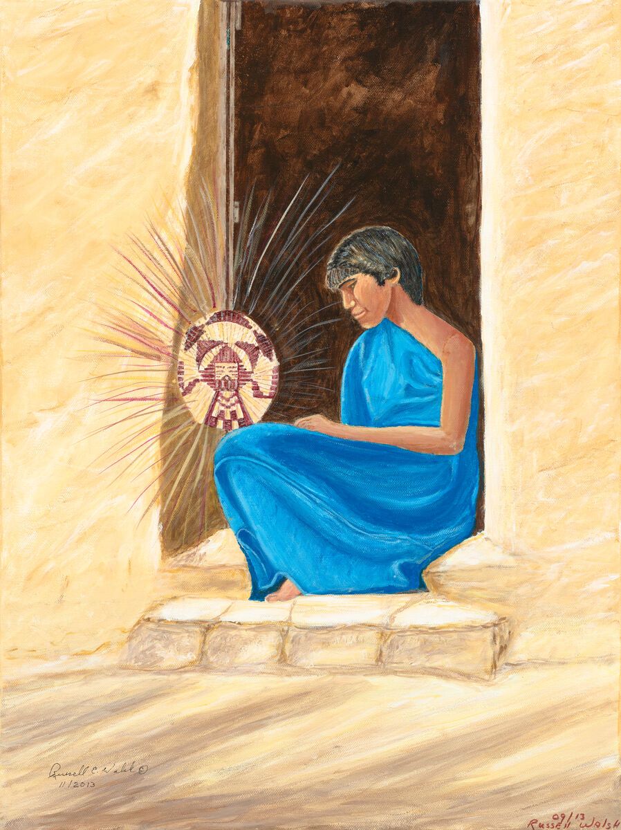 A Hopi mother weaving a wedding basket. In the Hopi tradition, the mother of a bride weaves a wedding basket for her daughter's new husband. The groom will keep the basket all his life and when he passes the basket will take his remains into the spirit world.